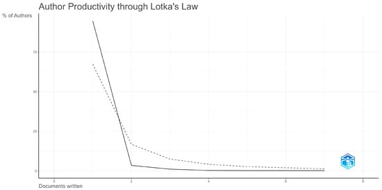 Figure 10 reveals the productivity of the authors using Lotka’s Law, which explains the number of publications of researchers, estimating that a reduced percentage of authors contributed to the majority of the articles [52].