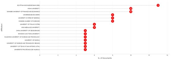 Figure 11 includes the 10 most representative universities that published in the fields of time series forecasting and AI by taking into account the number of publications. In first place was Egyptian Knowledge Bank (EKB) from Egypt with 13 documents, followed by Dongbei University of Finance and Economics and Hohai University, both from China with 10 documents each, while Chinese Academy of Sciences (China), Universidade de Aveiro (Portugal) and Unversity System of Georgia (United States of America) had eight publications each. King Abdulaziz University (Saudi Arabia) and University of Texas System (United States of America) published six papers each, while China University of Geosciences (China), Huazhong University of Science and Technology (China), Shanghai Jiao Tong University (China), University of Murcia (Spain), University of Science and Technology Beijing (China), University of Texas at San Antonio (USA) and Universitat Politecnica de Valencia (Spain) published five articles each.
