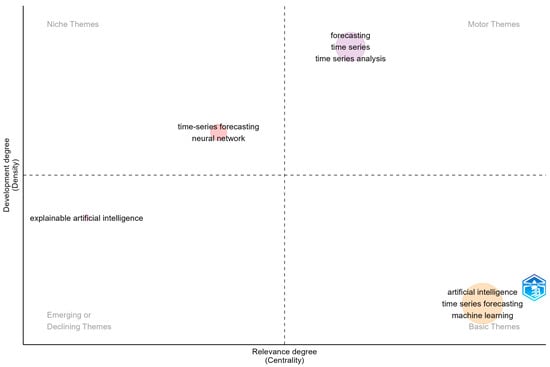 The decision to conduct a bibliometric analysis for evaluating the time series and AI domains is in accordance with the existing literature, focusing on extracting, in a proper manner, the main topics, key contributors, collaboration map, main research institutions, and the evolution of the research themes [16,20]. The bibliometric approach delves deeply into the analysis of the dataset using indicators such as the H-index or G-index, which will be further explained, together with graphical representations of Bradford’s Law or Lotka’s Law. Due to the nature of the scientific question, quantitative analysis is mandatory, evaluating the 10 most representative papers from the time series forecasting and AI fields.
