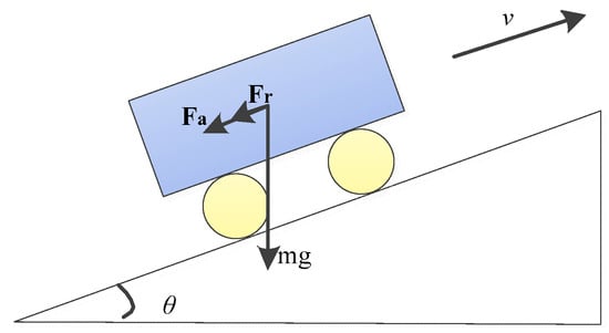 The main energy consumption of the vehicle during driving comes from the air resistance, tire rolling resistance, gravity, acceleration energy consumption, and braking energy consumption. Assuming that the vehicle travels at a constant speed, the vehicle force analysis is shown in Figure 1; then, we calculate the following: