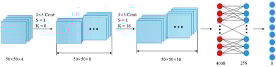 The neural network used in this paper has a four-layer structure: the first two layers are convolutional layers, and the last two layers are fully connected layers. The structure of the neural network is shown in Figure 3. The convolutional layers are suitable for extracting features from image pixels and matrices, as well as for recognizing certain underlying patterns. The number of neurons must be adjusted with the size of the input matrix, with larger matrices requiring more neurons and smaller matrices requiring fewer neurons. The fully connected layer fits a large amount of input information based on a linear relationship and outputs the final result. The number of neurons in the fully connected layer depends on the number of neurons in the previous layer. The input of the neural network in this paper is a four-channel graph (4 × 50 × 50). The four channels represent the elevation map, unmanned vehicle position, end point position, and terrain level. The first convolutional layer contains eight convolution kernels of a 3 × 3 size, which are convolved to obtain eight 50 × 50 feature maps, and the convolution step is 1 and the padding is 1 in the convolutional operation. The second convolution layer contains 16 convolution kernels of a 3 × 3 size, which are convolved to obtain eight 50 × 50 feature maps, and the convolution step is 1 and the padding is 1. The second convolutional layer contains 16 convolutional kernels of a 3 × 3 size, which are convolved to obtain 16 50 × 50 feature maps; the first fully connected layer has 40,000 nodes, and the 16 matrices output from the second convolutional layer are transformed and spliced into a one-dimensional vector of a 1 × 40,000 size; the second fully connected layer contains 256 nodes, and the output layer has 8 nodes representing the Q-values of eight actions.