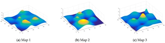 The hardware used in this simulation experiment included Intel® Xeon® CPU, 128 G RAM (Intel Corporation, Santa Clara, CA, USA), and NVIDIA GeForce GTX 1080 Ti (NVIDIA Corporation, Santa Clara, CA, USA). The platform was built based on Gym, and the results are presented in the MATLAB 2016b software environment. In order to verify the performance of the A-DQN algorithm, in this study, the simulation map with a 5000 m × 5000 m area and an elevation value of [0, 300] m was sampled as a 50 × 50 elevation raster map for the experiments; i.e., the x and y axis range was [0, 50], the z-axis range was [0, 3], and the width of the grid point was 100 m. A map of the simulation experiment is shown in Figure 4. After several trials with random starting and ending points in different rounds, the A-DQN algorithm hyperparameters were determined, as shown in Table 1.