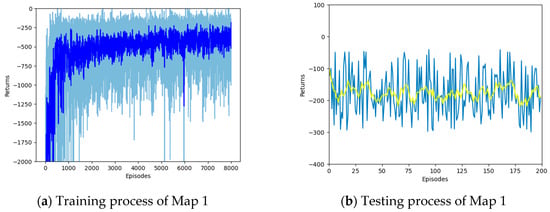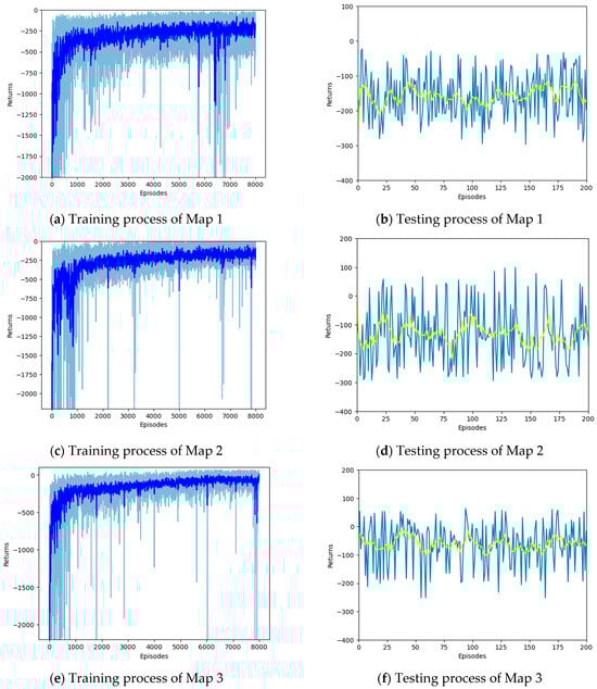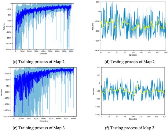 In order to verify the path and energy consumption balance effect, the terrain parameters were all set to 0 and the speed was set to 45 km/h at a constant speed for training at first. The variations in the reward with the training rounds of Map 1, Map 2, and Map 3 are shown in Figure 5a,c,e. A total of 200 sets of starting and ending points were randomly selected for testing, and the reward curves of the test rounds are shown in Figure 5b,d,f.