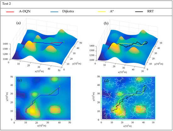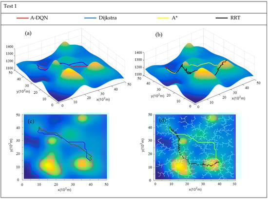 The simulation results of the A-DQN were compared with the RRT, A* algorithm, and Dijkstra algorithm. The numerical statistics of the results of 200 tests under different maps and different algorithms are shown in Table 2. The cost in the Dijkstra algorithm is computed as the sum of the three-dimensional distance and the energy consumption from the starting point to the current point, with the energy consumption calculated according to Equation (11). In the A* algorithm, the heuristic function calculates distance based on the intersection line between the vertical plane formed by the current point and the goal point and the terrain surface. The energy consumption along this path is also determined using Equation (11). Since the energy consumption of a path is as important as the distance traveled, a direct comparison is made by summing the two, with paths with smaller sums indicating better global properties.