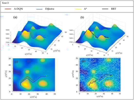 Test 3 path diagram: (a) A-DQN (red), Dijkstra (blue) 3D view of the planning path. (b) A* (yellow), RRT (black) 3D view of the planning path. (c) A-DQN (red), Dijkstra (blue) 2D view of the planning path. (d) A* (yellow), RRT (black) 2D view of the planning path.