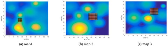 To verify the ability of the terrain recognition, a 5 × 5 range of muddy ground was set in Map 1, and the muddy ground range of 10 × 10 was set in Map 2 and Map 3, as shown in Figure 9. After setting up the muddy-terrain region, the agent underwent 8000 episodes of training. A 200-round test was conducted, and the training convergence curve and test results are shown in Figure 10.