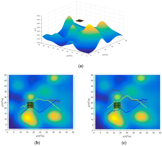 Comparison of paths before and after mud land setting of Map 1: (a) three-dimensional view of the muddy area; (b) test path map when mud land parameter is 0; (c) test path map when mud land parameter is 1.