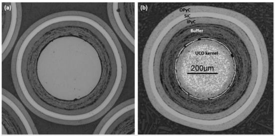 Cross section of modern TRISO fuel particles. (a) UO2 TRISO particle. (b) UCO TRISO particle []. Reprinted from Journal of Nuclear Materials, Volume 515, Paul A. Demkowicz, Bing Liu, and John D. Hunn, Coated particle fuel: Historical perspectives and current progress, pages 434–450, Copyright 2019, with permission from Elsevier.