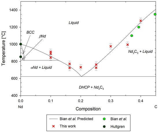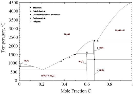 The neodymium–carbon system has been reported sparingly in the open literature with little experimental data to characterize the full phase diagram. Figure 3 illustrates the predicted phase diagram by Bian et al. [] with limited experimental data in reference to the following discussion. Thermodynamic properties have been approximated via phase equilibria modeling and prediction based on trends in the La-C, Ce-C, and Pr-C systems [,,]. Spedding et al. [] reported hexagonal Nd and cubic Nd2C3 phases in the 0 to 50 mol%C range via X-ray diffraction. Bian et al. [] added new data within this range by melting neodymium ingots in a graphite crucible at 1100 °C, 1200 °C, 1350 °C, and 1500 °C until carbon-saturated alloys were produced at 37, 39.3, 44.8, 49.7, and 49.2 mol%C, respectively []. The phases present in these samples were confirmed via back-scattering scanning electron microscopy (BSEM) [].