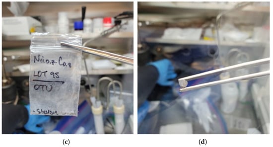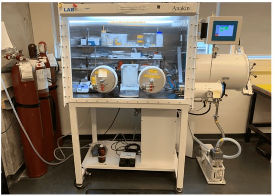 A small and a large antechamber are equipped on the side of the glovebox to permit ingress and egress of materials, and two lockable gloveports on the front of the glovebox allowed manipulation of tooling and equipment without exposure. The exhaust of both antechambers was fitted to a vacuum pump, with adjustable valving to inject either air or argon gas into the chamber. Use of the antechamber required its volume to be evacuated using the vacuum pump for 30 s, then re-filled with the necessary atmosphere, cycling three times before opening. The gloveports housed two black rubber gloves that were connected via pressed o-rings to maintain a pressure boundary, and the gloves were dressed with disposable extra-large nitrile gloves to prevent cross-contamination during sample work within the glovebox. An overview of the glovebox setup is provided in Figure 5.
