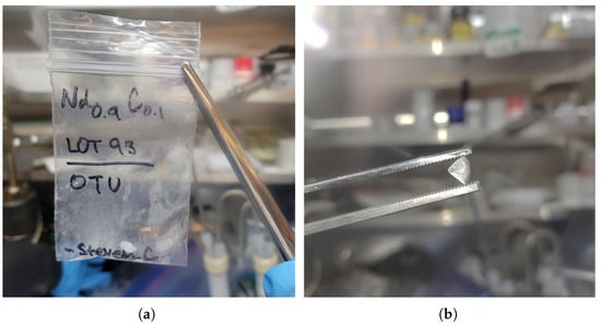 Neodymium carbide and cerium carbide samples were fabricated at the University of Texas at San Antonio (UTSA) (San Antonio, TX, USA) with a customized Tri-Arc Melt Furnace, Model 5TA, from Centorr Vacuum Industries. Nd and Ce foil with 99.9% purity (sourced from Alfa Aesar, Haverhill, MA, USA) were refined through a melt–clean–remelt process to remove impurities. These were reacted with graphite under an inert, ultra-high purity argon environment to produce four Nd-C and two Ce-C samples of various molar compositions, which were shipped to Ontario Tech University (OTU) and then stored in an argon environment to prevent potential oxidation. A more thorough description of the fabrication process is described by Cavazos et al. []. The planned crucibles for the DSC experiments had a measured inner diameter of 5.95 mm and inner height of 3.20 mm. However, the fabricated samples were too large to fit into the volume, having a diameter of approximately 8 mm and height of 4 mm. The samples were resized at OTU within an argon-filled glovebox to fit within the measurement crucibles.