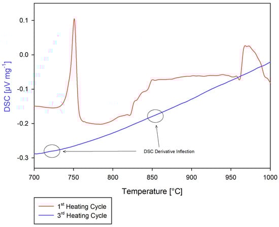 The 40 mol%C, 60 mol%Nd sample and 67 mol%C, 33 mol%Ce samples compared well to experimental and predicted values in the open literature. Mixed solids experience non-congruent melting that can add difficulty to measuring phase transitions. After initial melting and during subsequent cooling of a mixed phase, the phase of each crystal will tend to separate from the mixture and fail to completely form the predicted low-temperature solid phase []. As a result, eutectic and liquidus transitions of neighboring compositions may appear in the measured sample, and therefore, annealing of the sample is necessary to return to equilibrium []. Practically, this would necessitate an isothermal hold for all DSC measurements in this campaign of potentially 48 h and at temperatures slightly below the first predicted phase transition to improve accuracy of onset temperatures []. However, this explains the lower temperature effect seen on some of the tests, such as Nd2.5-4-1 at approximately 680 °C. This effect is not a real transition and is instead suspected to be an artifact of non-congruent melting, and therefore, it is omitted in this work.