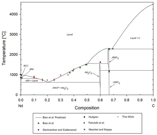 Nd-C predicted. phase diagram by Bian et al. [], with experimental data by Faircloth et al. [], Gschneidner and Calderwood [], Paderno et al. [], and Hultgren [].