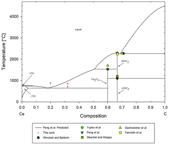 Ce-C predicted phase diagram by Peng et al. [], with experimental data by Winchell and Baldwin [], and Yupko et al. [].