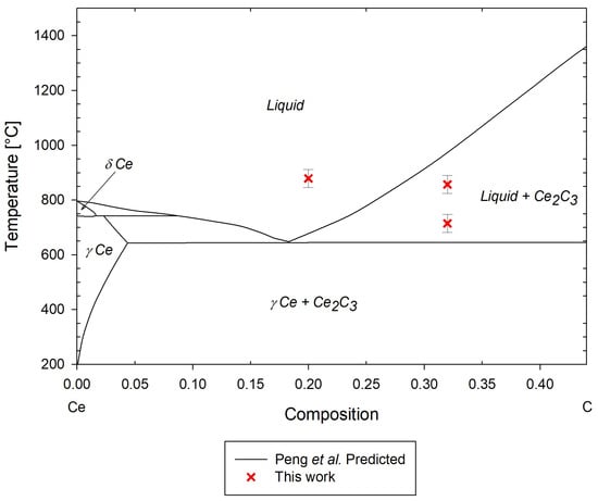 The thermodynamic assessment by Bian et al. [] demonstrated the most complete phase diagram reported in the open literature for the Nd-C system, incorporating existing measurements of specific molar concentrations and adding new experimental data. Similarly, Peng et al. [] performed a comprehensive review of existing literature and applied the Calphad method to generate the most comprehensive phase diagram of the Ce-C system in the open literature. Both thermodynamic systems are similar in structure and behavior, as is expected of light rare earth elements [,,,,]. These two thermodynamic analyses, along with the works described earlier, provide the basis of comparison for the present work.