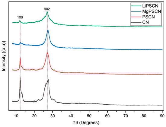 After the addition of Li and Mg the peak intensities for both the (002) and (100) diffraction planes decreased, suggesting that the presence of these dopants further reduced the crystallinity of the material []. Moreover, the distortion of nitride pores and the alteration of the interlayer distance further indicate strong interactions between the dopants and the host g-C3N4 [,].