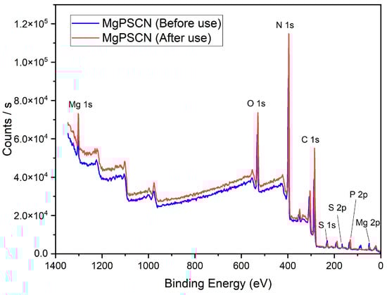 Survey scan of XPS of MgPSCN before and after use.