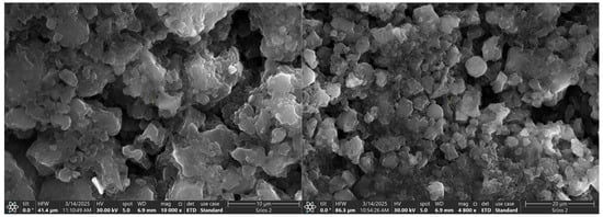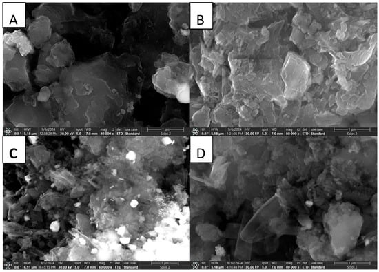 Figure 3 presents SEM images of the porous samples, highlighting distinct morphological characteristics. The morphology of bare g-C3N4 (CN) (Figure 3A) exhibits an irregular granular and layered structure with numerous pores, as also shown in the previous literature [,]. This porous structure is attributed to the liberation of ammonia (NH3) and carbon dioxide (CO2) gases during the thermal decomposition of melamine []. In contrast, CN doped with phosphorus and sulfur (PSCN) (Figure 3B) demonstrates a thinner, plate-like structure with a higher surface porosity compared to undoped g-C3N4. A significant difference is observed in the layer distribution and pore size, with the pores in PSCN increasing in dimension as confirmed by textural analysis.