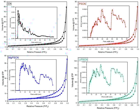 Adsorption–desorption isotherms and pore volume distribution for CN, PSCN, MgPSCN, and LiPSCN.