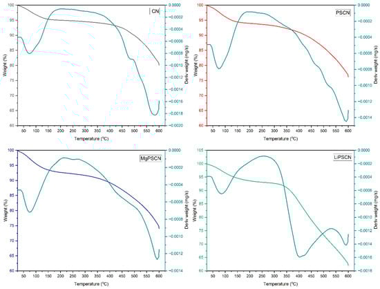 TGA-DTG patterns of the CN, PSCN, MgPSCN, and LiPSCN.