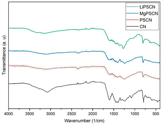 FTIR spectra of the CN, PSCN, MgPSCN, and LiPSCN.