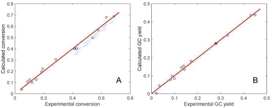 Parity diagrams for glycerol conversion (A) and glycerol carbonate yield (B).