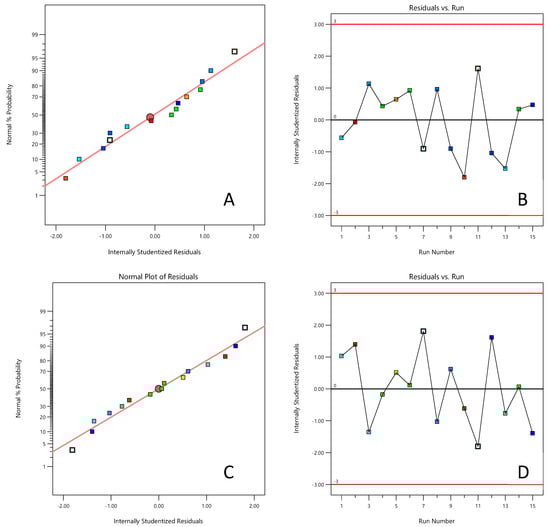 Normal probability plot ((A)—glycerol conversion; (C)—GC yield) and internally studentized residuals ((B)—glycerol conversion, (D)—GC yield).