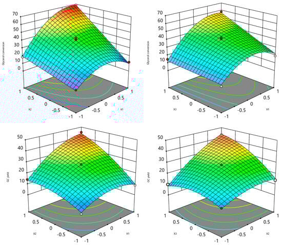 Given the coefficients in Equations (3) and (4) and plots in Figure 10, both glycerol conversion and GC yield are positively influenced by reaction temperature (X1), catalyst amount (X2), and reaction pressure (X3). The impact of the key factors on glycerol conversion and GC yield is illustrated in Figure 10. The ANOVA for the GC yield model is given in Table 5. Based on these values, an F-value 114.3 for the model suggests that this is significant, and p-values below 0.05 indicate that the model terms are significant.