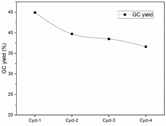The reusability of the MgPSCN catalyst in the synthesis of glycerol carbonate was investigated over four consecutive reaction cycles under optimal conditions. Before each reuse, the catalyst was rinsed with ethanol and subsequently dried at 85 °C for 60 min to ensure the removal of any residual byproducts or impurities that could influence its catalytic performance.