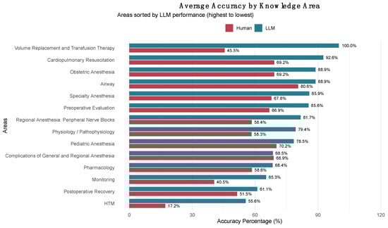 Comparison of average accuracy between human examinees and large language models (LLMs) across 15 anesthesiology knowledge domains. Areas are sorted by LLM performance from highest to lowest accuracy. Red bars represent human performance, and blue bars represent LLM performance.