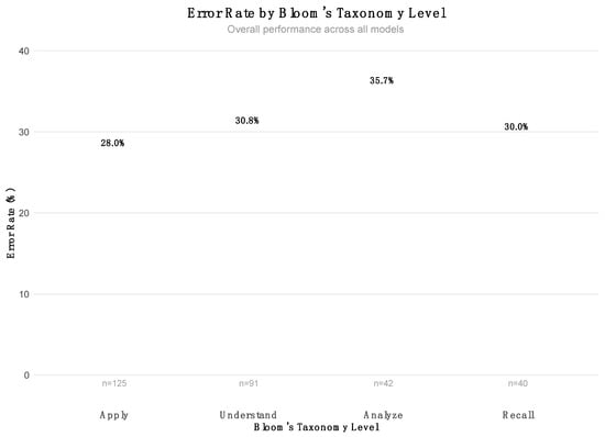 Among the 298 total items administered across the nine models, the distribution across Bloom’s cognitive levels was as follows: Apply (125 items, 41.9%), Understand (91 items, 30.5%), Analyze (42 items, 14.1%), and Recall (40 items, 13.4%). This distribution indicates a deliberate emphasis on higher-order cognitive processes, particularly the application and comprehension of clinical knowledge, which aligns with the CONACEM exam’s focus on critical thinking and reasoning in anesthesiology. The associated error rates for these categories are shown in Figure 4.