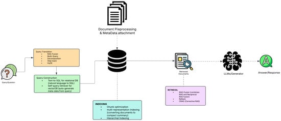 Query Optimisation in RAG systems addresses problems that arise from imprecise, ambiguous, or complex user queries that hinder effective retrieval. To improve outcomes, query expansion techniques like multiquery generation and subquery planning enrich the context by breaking down complex queries or generating parallel, well-designed queries through prompt engineering. Validation methods, such as Chain-of-Verification [18] (CoVe), ensure reliability by reducing hallucinations in expanded queries. Query transformation further enhances retrieval by refining the original query using techniques such as query rewriting with LLMs or smaller models (e.g., RRR [19,20]), generating hypothetical documents with HyDE [21], or employing step-back prompting [22] to create high-level conceptual queries that complement the original. Additionally, query routing directs queries to specific RAG pipelines according to context. Metadata routers filter results using keywords and metadata, while semantic routers leverage the query’s meaning, with hybrid approaches combining both methods for robust routing. Together, these techniques improve query clarity, retrieval precision, and adaptability across diverse scenarios.