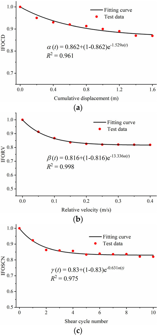 The laboratory test results [27,32] and fitting curves with test data. (a) The variation law of IFOCD with cumulative displacement. (b) The variation law of IFORV with relative velocity. (c) The variation law of IFOSCN with shear cycle number.
