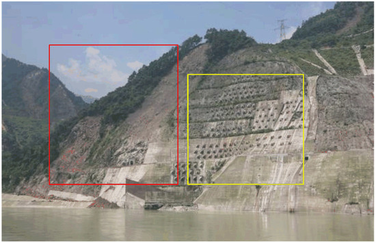 Anchor cables are the main preventive measure in slope engineering. Figure 2 compares the reinforced slope (yellow area) and the unreinforced slope (red area) of Zipingpu Water Conservancy Project during the Wenchuan earthquake, highlighting the importance and reliability of anchor cables. There is little information about anchor cables in FDEM, and the present study tries to study them by referring to the characterization method of anchor bolt in FDEM.