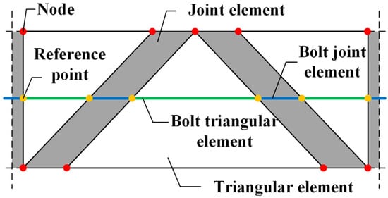 In the one-dimensional element model method, the bolt element is considered a one-dimensional, non-thickness line element. The coordinates of the two endpoints of each cable are given in the input file, and the intersections of the two endpoints with the triangular and joint elements are defined as reference points. The reference points are grouped in pairs to form calculation couples, where the calculation couple in the triangular element is called the bolt triangular element, and the one in the joint element is the bolt joint element (Figure 3).