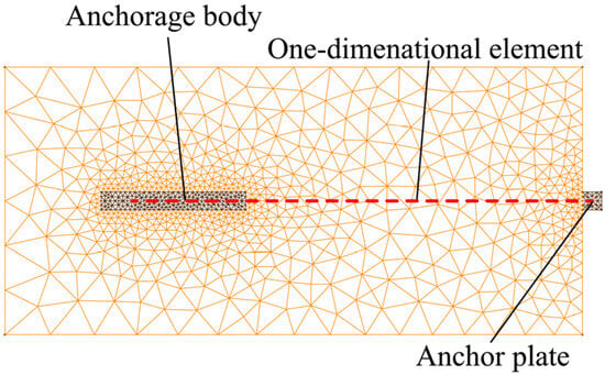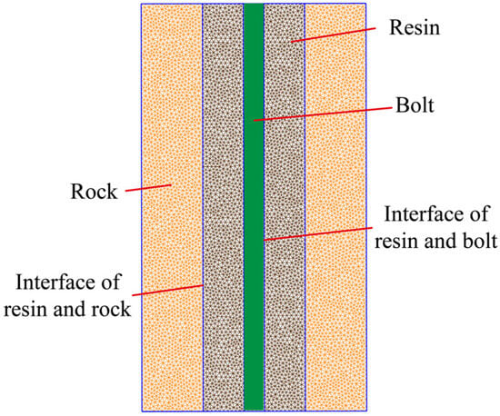 The entity element model method focuses on studying the anchor bolt restraint mechanism and the interaction characteristics of the bolt structure with the anchorage body, which requires fine modeling of the anchor bolt and anchorage body [38]. Among them, the anchor bolt and anchorage body are divided into triangular and joint elements, as in the case of rock mass. The resin-bolt and resin-rock interfaces are characterized by the joint element (Figure 4). In specific engineering calculations, the physical and mechanical parameters of the anchor resin and bolt are the same as those of rock mass. They are calculated together until the anchor bolt comes into play. Then, the initial stress of the anchor resin and bolt is reset to zero, and their respective properties are assigned before recalculation [38]. As a metal material, anchor bolt has apparent yield and strain hardening phenomena, and its constitutive modification is required. More details about the constitutive model can be found in Liu et al. (2019) [37].