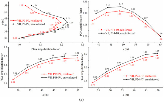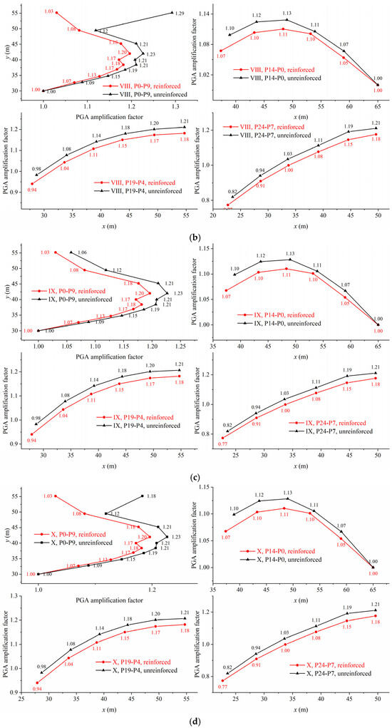 Comparison of variations in the PGA amplification factors for the unreinforced and cable-reinforced slopes. (a) Seismic intensity VII (1.1 s–11 s). (b) Seismic intensity VIII (1.1 s–9.66 s). (c) Seismic intensity IX (1.1 s–7.2 s). (d) Seismic intensity X (1.1 s–6.2 s).