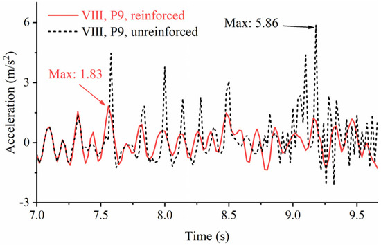 The dynamic response of the unreinforced slope and the cable-reinforced slope is inconsistent under dynamic load. Still, on the whole, the dynamic response of the cable-reinforced slope is weaker than that of the unreinforced slope. Taking seismic intensity VIII as an example, the PGA amplification factor at the slope surface can be lower by 4% on average, about 1.4% at P14–P0 in the horizontal direction, 3% at P19–P4, and 3.8% at P24–P7. This is attributed to the ability of prestressed anchor cables to strengthen the slope and form a more rigid whole with it, which can significantly reduce the PGA of the slope under dynamic load. As shown in Figure 9, the acceleration time history at P9 at the top of the slope also confirms this because the existence of a prestressed anchor cable, on one hand, improves the integrity and joint strength of the slope, and on the other hand, reduces the vibration acceleration of the slope.