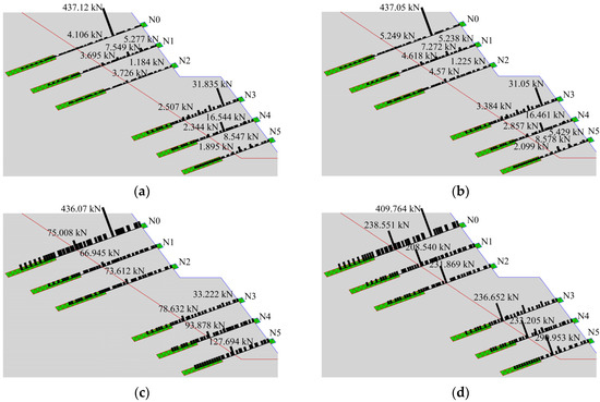 The diagrams of anchor cable axial force at t = 7 s for all seismic intensities. (a) Seismic intensity VII. (b) Seismic intensity VIII. (c) Seismic intensity IX. (d) Seismic intensity X.