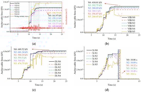 Figure 11 is the time history of the anchor cable axial force at the structural plane under different seismic intensities. It can be seen from the figure that with the increase in seismic intensity, the axial force of each anchor cable grows larger to a different degree (the average maximum axial force of anchor cables under each seismic intensity: VII is 161.165 kN, VIII is 364.878 kN, IX is 563.883 kN, and X ≥ 648 kN). The growth rate is related to the cable location and the seismic waveform (take VII for example, the mutation of the axial force in Figure 11a corresponds to the local peak of the seismic wave), the lowest anchor cable N5 grows the fastest, while cables N4–N0 slow down roughly in order. At the end of the earthquake, the maximum anchor cable axial force does not seem to conform to the law of decreasing from bottom to top, which is related to the seismic waveform and the physical and mechanical properties of the slope; the generation order of crack and the distribution of the stress wave will affect the stress state of the anchor cable, and eventually present an irregular maximum axial force. Anchor cable first fails in the hazardous area and then gradually spreads, and its failure sequence is also related to the seismic wave characteristics. When the seismic intensity is X, the failure sequence of the anchor cable is N0 (10.06 s)-N2 (10.09 s)-N1 (10.32 s)-N3 (10.36 s)-N4 (10.48 s)-N5 (10.6 s), which exhibits noticeable continuous failure effect and is consistent with the distribution of PGA amplification factors in Figure 8d. Therefore, the continuous failure effect of anchor cables should be considered in the anchorage system design process, but the present study does not continue to investigate it in depth, and the authors will continue to carry out the research related to anchor cables in FDEM in future work.