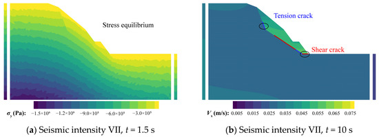 In order to study the dynamic evolution of the landslide–anchorage structural system under seismic load, eight computational models with four different seismic intensities (VII, VIII, IX, and X) are established for the two calculation conditions: anchor cable-unreinforced and -reinforced, respectively.