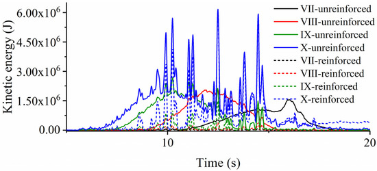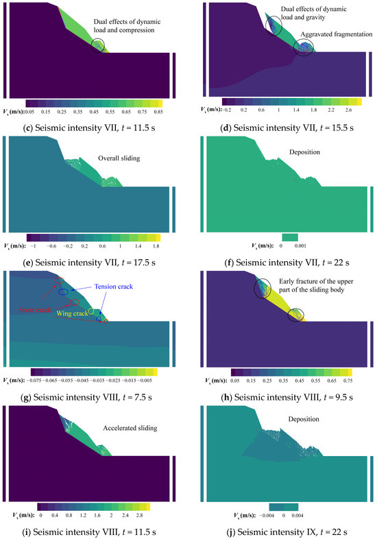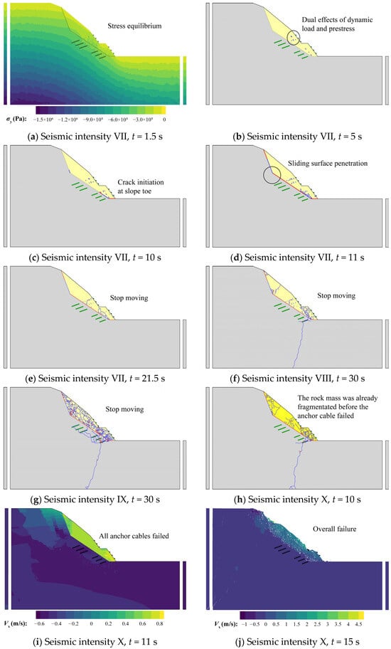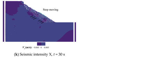 - Sliding surface penetration stage. This stage is the same as the dynamic evolution law of the unreinforced condition: take seismic intensity VII as an example, the toe of the inclined sliding surface is the first to tensile failure caused by the reciprocating motion of the dynamic load at t = 9.98 s; then, shear failure occurs almost simultaneously at the horizontal structural plane, tensile failure occurs at the lower part of the trailing edge of the structural plane (Figure 15c, t = 10 s), and finally, the inclined sliding surface and the trailing edge of the structural plane continue to extend to penetration under the dual effects of gravity and seismic load at t = 11 s (Figure 15d). For other seismic intensities (Figure 16), the crack initiation time is 7.26 s for VIII, 6.24 s for IX, and 5.46 s for X, and the sliding surface penetration time is 9.31 s for VIII, 7.02 s for IX, and 5.91 s for X. It can be seen that the crack initiation time and penetration time of the structural plane are advanced with the increase in the seismic intensity. At the time of structural plane penetration, the crack number of the model at each seismic intensity is 129 (VII), 130 (VIII), 151 (IX), and 141 (X), showing an overall increasing trend and indicating that the number of secondary cracks at this stage is positively correlated with the seismic intensity. The kinetic energies of the model at the end of this stage are 9240 J (VII), 12,073 J (VIII), 21,837 J (IX) and 27,148 J (X), which is mainly related to the input seismic wave energy. The landslide–anchorage structural system does not fail under seismic intensities VII, VIII, and IX, and does not enter the overall damage stage after this stage; instead, it is further fragmented under seismic loads, but the landslide–anchorage structural system is still tightly integrated owing to the prestressed anchor cables (Figure 15f,g). The final crack numbers are 199, 440, and 1492 for intensities VII, VIII, and IX, respectively (Figure 13), and the law is apparent: the damage degree of the landslide–anchorage structure system increases with the increase in seismic intensity.
