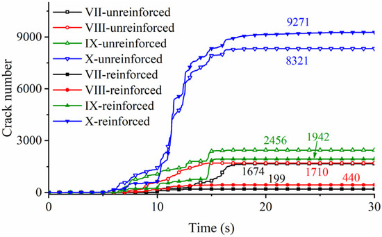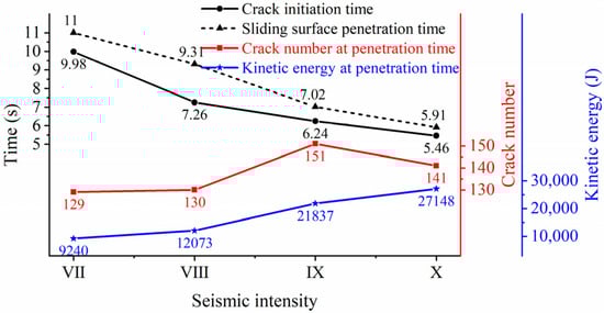 - Sliding surface penetration stage. When the seismic intensity is VII, tensile cracks caused by reciprocating dynamic loads first appear at the toe of the lower part of the inclined sliding surface at t = 10 s (7.27 s for VIII, 6.33 s for IX, and 5.45 s for X), followed by shear failures on the horizontal sliding surface, and tensile failures on the lower part of the trailing edge structural plane (Figure 12b); and finally, t = 10.02 s (7.5 s for VIII, 6.45 s for IX, and 5.48 s for X), the inclined sliding surface and the trailing edge structural surface keep extending to penetration for shear failures under the dual effects of gravity and seismic load (Figure 12g). At this stage, the crack number of the model at all seismic intensities grows to 98 (Figure 13), and the time required for the sliding surface to penetrate continues to decrease with increasing seismic intensity. As shown in Figure 14, the model kinetic energy changes little in this stage and is caused only by seismic loads.