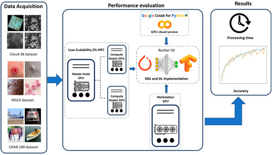 In recent years, various strategies have been explored to accelerate the training process of DL models. One of the most widely accepted approaches is parallel computing. Numerous studies have shown that incorporating HPC into AI significantly reduces training times and yields more accurate results, especially when handling large-scale data. In medical investigations, HPC is very useful, as shown in the work of [13], in which a modular pipeline technique is presented to detect tumor regions in digital specimens of breast lymph nodes using DL models. They showed that this technique is applicable to both local machines and HPC resources using containers. Additionally, they mentioned that distribution training was carried out using four NVIDIA K80 GPUs and a single NVIDIA V100 GPU. In the field of hyperspectral remote sensing, Plaza et al. [14] conducted a study that addressed the computational challenges that arise in hyperspectral remote sensing applications due to the high dimensionality of the data generated by modern sensors. This article explores HPC techniques to improve the efficiency and accuracy of the processing and analysis of these data. Exact sciences, such as physics, have also greatly benefited from the use of HPC. For example, the work by Florin Pop [15] analyzed the existing computational methods for high-energy physics (HEP) from two perspectives: numerical methods and HPC. This article highlights the importance of stable simulations and numerical methods for high-precision analysis, experimental validation, and visualization in HEP. Some of the techniques mentioned and simulated were Monte Carlo, Markovian Monte Carlo, the overflow method in particle physics, kernel estimation in HEP, and random matrix theory. Furthermore, within mathematics, Singh et al. [16] highlighted the importance of implementing HPC to solve complex mathematical problems that would be intractable using traditional methods. Beyond infrastructure-level comparisons, it is important to consider the evolution of deep learning applications in emerging fields that demand computational efficiency and adaptability. For instance, Wang et al. [17] presented a novel self-supervised graph contrastive learning method for structured data, demonstrating how deep learning models can be optimized using positive sample selection strategies. Specifically, in the performance evaluation of DS, multiple studies have implemented DDL frameworks to reinforce the theory that using HPC improves the accuracy of AI task results. Table 1 lists the main studies that inspired this study.