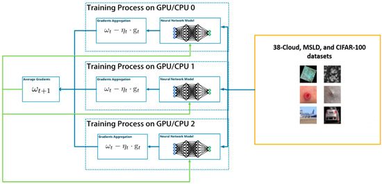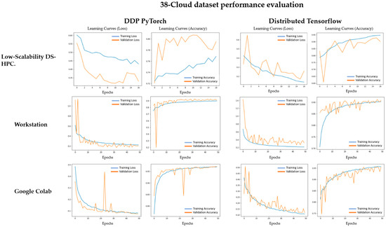 In the case of the LSDS-HPC infrastructure, an epoch configuration was used based on the number of GPUs used. In this case, the ratio between epochs used in the experiments with Workstation and Google Colab was 50/1 (50 epochs between 1 GPU); in the LSDS-HPC infrastructure, the ratio is 50/3 (50 epochs between 3 GPUs) due to the three NVIDIA GTX 1050ti cards used. On the LSDS-HPC infrastructure, the decision to train the models for 17 epochs with DDP and MultiWorkerMirroredStrategy was based on the principle of scaling the learning rate and adjusting the number of steps per epoch to ensure an equivalent total training amount that allows for convergence similar to that of a single GPU. This strategy is crucial in DP, where each GPU (worker) processes a portion of the total batch size. As the number of GPUs increases, the effective batch size that the model processes in a single optimization step also increases, justifying the need for these adjustments to maintain the stability and efficiency of the DDL [52]. The batch size was adapted to the volume and complexity of the dataset, with values of 8, 32, and 128 for the 38-Cloud, MSLD, and CIFAR-100 datasets, respectively. Finally, the learning rate was adjusted to 0.003 for 38-Cloud and 0.001 for MSLD and CIFAR-100, seeking a balance between the convergence speed and stability during training. It is worth mentioning that these settings were applied during training on both the Workstation and Google Colab environments.