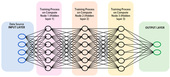 MP is a distributed training strategy in which the architecture of a neural network is partitioned across several devices or compute nodes. Instead of replicating the entire model in each worker, as in data parallelism, this approach assigns different layers or components of the model to separate nodes [35]. For instance, one node handles the first hidden layer, another handles the second, and so forth, as shown in Figure 3. This allows extremely large models to be trained even when their full architecture exceeds the memory limits of a single GPU and CPU.