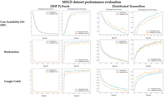 For the MSLD dataset (Figure 6), which represents a small and specialized set of clinical images, the model achieved high training and validation accuracies in a few epochs. The loss quickly stabilized, suggesting the rapid adaptation of the model to the visual characteristics of the dataset. This behavior reinforces the model’s effectiveness in environments with balanced data and restricted domains. The DS-HPC infrastructure proved suitable for fast and efficient training on this type of dataset for both DDP PyTorch and Distributed Tensorflow since their learning curves are the most correlated. Although the accuracy and loss values were the lowest in the experiments, it demonstrated better agreement in its graphical representation, unlike its training in Workstation and Google Colab, which, in some cases, showed overfitting between the training and validation data.