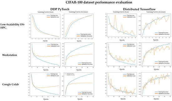 In the case of the CIFAR100 dataset (Figure 7), characterized by high interclass variability and low resolution (32 × 32), a more fluctuating behavior in the validation accuracy was observed, causing overfitting from its first iterations or epochs. Although the training loss was notably reduced, the accuracy stabilized at around 70% using DDP PyTorch, indicating generalization challenges in this dataset. Despite these limitations, the model achieved an acceptable classification capacity considering the complexity of the set, and the low-scalability DS-HPC infrastructure allowed efficient execution owing to the compact size of the images. It is important to note that only the Workstation, Colab, and Distributed TensorFlow results in LSDS-HPC showed considerably poor performance, prompting further investigation into the behavior of this dataset when trained with the ResNet50 architecture.