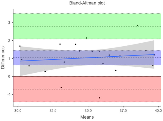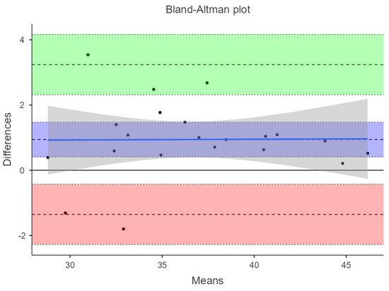 When analyzing average agreement, the one-way random model (ICC1k) and the two-way random model (ICC2k) produced ICC values of 0.987 (95% CI: 0.973–0.994), while the two-way fixed model (ICC3k) returned a nearly identical value of 0.987 (95% CI: 0.972–0.994). These findings indicated excellent intra-rater reliability, suggesting that the MyJump application provided consistent and repeatable CMJ measurements across trials, and the low SEM and SEE values reinforced the precision of the measurements, demonstrating that systematic error was minimal.