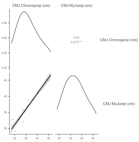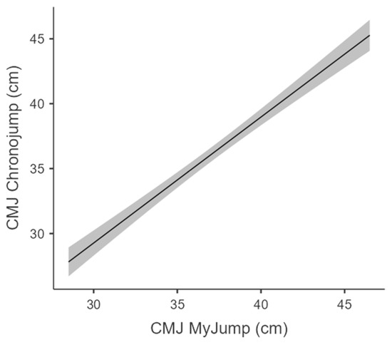 To further evaluate the association between MyJump and Chronojump for CMJ height measurements, a Pearson correlation analysis was conducted (Table 4 and Figure 3). The results indicated a strong positive correlation (r = 0.972, p < 0.001), suggesting that MyJump measurements closely align with those obtained from Chronojump, where 95% confidence interval (CI) ranged from 0.930 to 0.989. Additionally, Spearman’s rho (ρ = 0.960, p < 0.001) confirmed this strong association, indicating that the rank order of jump heights is preserved across both measurement methods. The correlation plot (Figure 3) illustrated a near-perfect linear trend between the two devices. The narrow confidence band around the regression line further suggests high measurement consistency between MyJump and Chronojump.